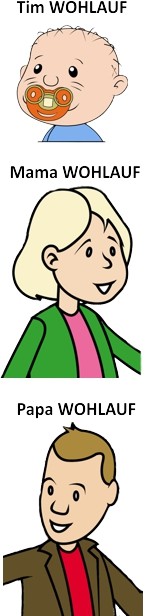 Die 3 köpfige Familie besteht aus dem kleinen Racker TIM, der seine Eltern immer wieder ganz schön zur Verzweiflung treiben kann und seinen Eltern MAMA & PAPA Wohlauf.