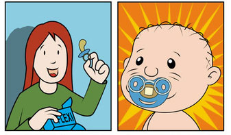 Mama Wohlauf bekommt von der Babyschwimmschule eine schöne Schmuckverpackung mit 2 bedruckten Werbeschnullern der Babyschwimm-schule geschenkt. Die Schnuller gefallen Tim durch das lustige Gesicht besonders und er ist immer richtig gut gelaunt ...